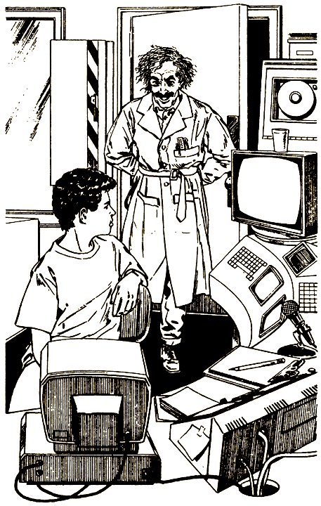 – Добро пожаловать! Я – доктор Бок. Прошу вас, проходите в дверь слева. – Он нажимает кнопку на щитке. – Спускайтесь по лестнице в мою лабораторию, где состоится пресс-конференция.