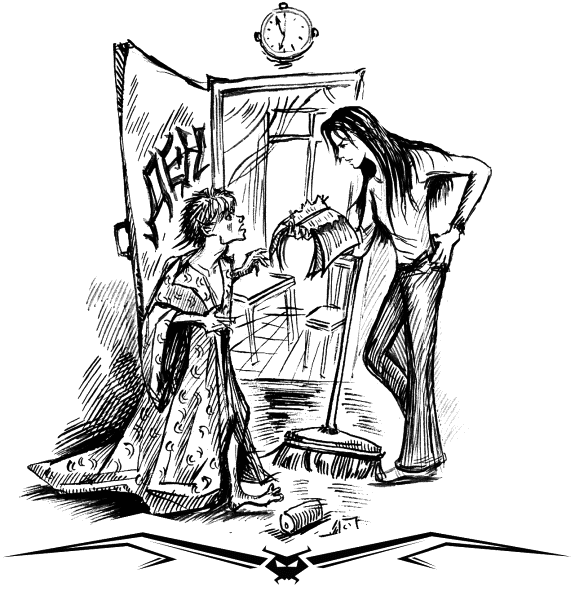 – Диня, как позвонить в Темный Универ? – громко отчеканила Влада, сунув домовому под нос выключенную мобилку.