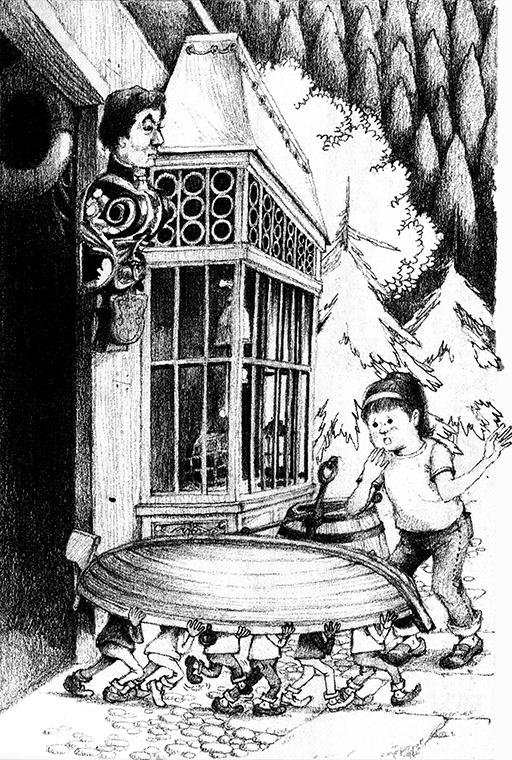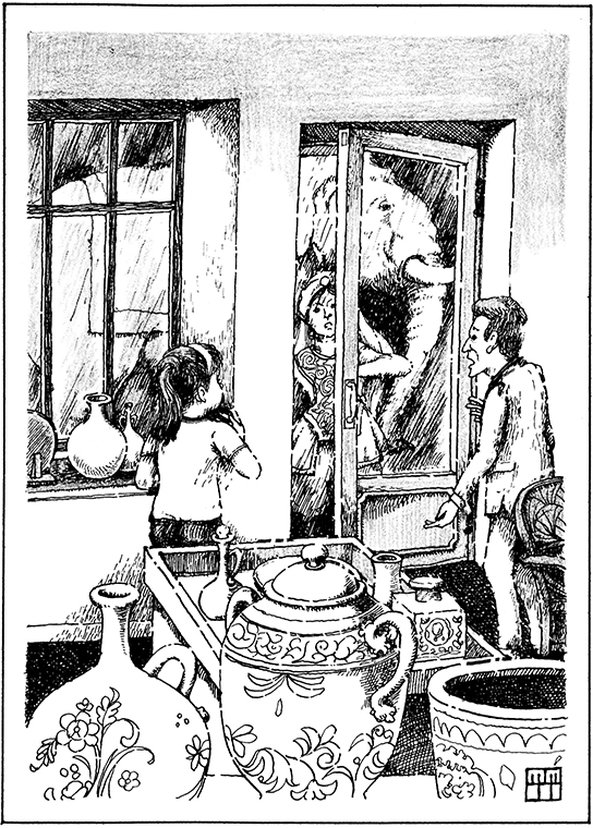 Сикка вдруг замолчал и прислушался. Издалека доносился ужасный грохот. Он становился всё сильнее и сильнее, пока магазин Сикки не начал трястись и дрожать, как во время землетрясения. Фарфоровая посуда на полках со звоном ударялась друг о друга. Сикка и Лина вцепились в подоконник и выглянули наружу. Из леса выскочил огромный серый слон величиной с магазин Сикки и бросился к ним. Перед магазином он резко остановился. Какая-то женщина, ухватившись за хобот, спрыгнула с мокрой от дождя спины слона и вбежала в магазин.