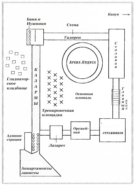 Когда собрались последние гладиаторы, Макрон окинул взглядом лудус, а Акулео приказал людям построиться. Слева от него стояли деревянные тренировочные палусы. Справа находилась тренировочная Арена, копия гораздо большей Арены в Капуе, построенная из дерева с галереями, способными вместить более двухсот зрителей. Двое охранников стояли на посту к югу от тренировочной Арены, сбоку от главного входа в лудус, внушительное сооружение с причудливо украшенной аркой над воротами, на которой был обнадеживающий символ бога Секуритаса. По обе стороны от арки был построен ряд караульных помещений, а также одиночные камеры для недисциплинированных гладиаторов. Решетка закрывала проем ворот, а также внешнюю дверь с засовом снаружи. Два дополнительных охранника постоянно дежурили у внешней двери. Им разрешали открывать дверь только тогда, когда прибывали обычные фургоны с едой и вином для лудуса. Единственный другой вход был через парадные двери в передней части помещения ланисты. Во всяком случае, место казалось достаточно безопасным.