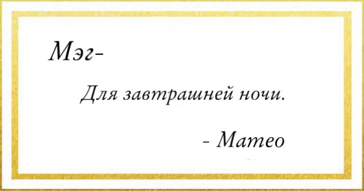 После того, как все закончилось, Матео дарит Мии подарок. Я не могу отделаться от мысли, что ему следовало сделать это до ужина, тогда она была бы в большем восторге от милой коричневой кожаной сумки – мессенджера, которую он подарил ей на первый семестр учебы в колледже, хотя даже после ужина она с облегчением видит конверт с деньгами, который он сунул внутрь для ее учебников.