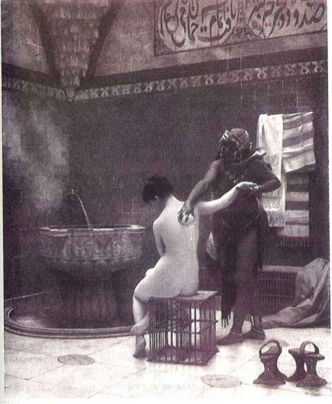 Не успев и закрыть за собой дверь, они заключили друг друга в объятия и предались любовным утехам. Жена же тем временем, сообразив, какую ошибку она совершила, выскочила из хамама и стала одеваться…