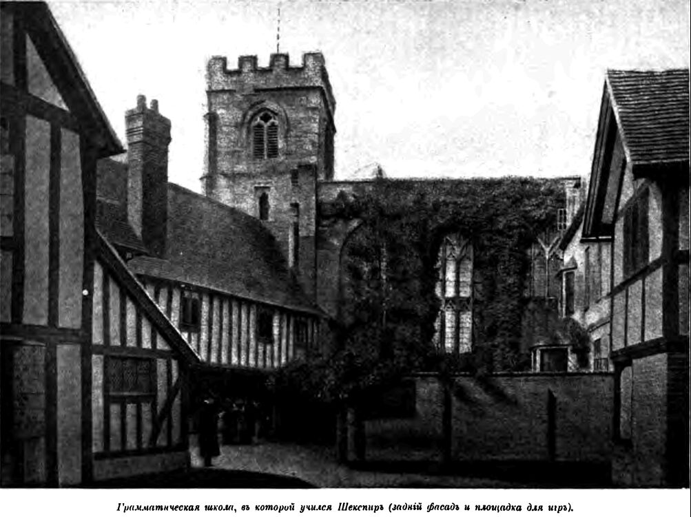 Несомнѣнно привязанный къ родинѣ, Шекспиръ уже первые свои заработки употреблялъ на то, чтобы обзавестись въ Стратфордѣ недвижимостью. Такъ въ 1597 г. онъ покупаетъ самый большой домъ въ Стратфордѣ, носившій названіе. Новаго мѣста" («New Place»). Въ этомъ домѣ поселяется его семья, здѣсь онъ самъ живетъ во время все учащающихся съ первыхъ лѣтъ новаго столѣтія побывокъ, здѣсь проводитъ остатокъ жизни и здѣсь же умираетъ. Недвижимая собственность его далеко не ограничивается Нью Плэсомъ. За него онъ заплатилъ сравнительно еще немного – 60 фн. A въ 1602 году все растущее благосостояніе даетъ ему возможность купить земли подъ Стратфордомъ за 220 фн. (по нынѣшнему около 20000 p.). Конечно, онъ становится первымъ лицомъ въ городѣ и по желанію наиболѣе вліятельныхъ горожанъ беретъ въ 1605 г. въ аренду городскіе доходы (десятину) за огромную сумму 440 фн. (по нынѣшней 40-45000 p.). Земельная собственность уже по самому существу своему присоединяла іомена Шекспира къ джентри, т. е. среднему дворянству. Но онъ захотѣлъ и легализировать свое положеніе и въ 1597 г. начинаются хлопоты о гербѣ. Хлопоталъ, какъ это было принято тогда, отецъ, но старался, конечно, Джонъ Шекспиръ не о себѣ, a о славномъ сынѣ своемъ, который не забывалъ стараго отца и съ лихвою вернулъ ему утраченные достатки. Хлопоты тянулись нѣсколько лѣтъ, но благодаря связямъ Шекспира съ самыми вліятельными вельможами увѣнчались успѣхомъ и въ 1599 г. Шекспиръ получилъ гербъ – щитъ, съ копьемъ въ діагонали, и надъ щитомъ соколъ, опять съ копьемъ въ лапѣ: стиль «потрясателя копья», такимъ образомъ, строго выдержанъ.