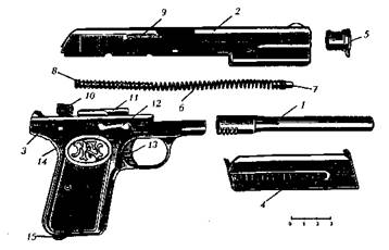 1 – ствол, 2 – затвор, 3 – рама, 4 – магазин, 5 – втулка ствола, 6 – возвратная пружина, 7 – фиксатор, 9 – выбрасыватель, 10 – курок, 11 – колодка рамы, 12 – затворная задержка, 13 – спусковой крючок, 14 – автоматический предохранитель, 15 – защелка магазина.