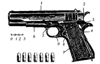 1 – затвор, 2 – курок, 3 – флажковый предохранитель, 4 – автоматический предохранитель, 5 – затворная задержка, 6 – рама, 7 – рукоятка, 8 – кнопка защелки магазина, 9 – спусковой крючок.