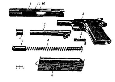 1 – затвор, 1а – большой вырез затвора, 16 – малый вырез затвора,2 – рама, 3 – ствол с серьгой, 4 – возвратная пружина, 5 – затворная задержка, 6 – втулка, 7 – направляющая трубка, 8 – магазин.