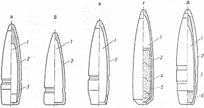 Пули патрона 7,62×53R: а – обыкновенная со стальным сердечником, б – быкновенная со свинцовым сердечником легкая, в – обыкновенная со свинцовым сердечником тяжелая, г – трассирующая, д – бронебойно-зажигательная