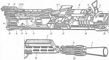 Разрез пулемета КПВ: 1 – пламегаситель, 2 – ствол, 3 – ручка ствола, 4 – стопор муфты, 5 – мушка с основанием, 6 – крышка ствольной коробки, 7 – ползун подачи, 8 – движок подачи, 9 – толкатель, 10 – крышка ствольной коробки, 11 – рычаг шептала, 12 – возвратно-боевая пружина, 13 – прицел, 14 – буферная пружина, 15 – затыльник ствольной коробки, 16 – ствольная коробка, 17 – затворная рама, 18 – ролик ускорителя, 19 – затвор, 20 – приемник, 21 – направляющая ствола, 22 – ствольная пружина, 23 – муфта ствола, 24 – кожух ствола, 25 – дульное устройство