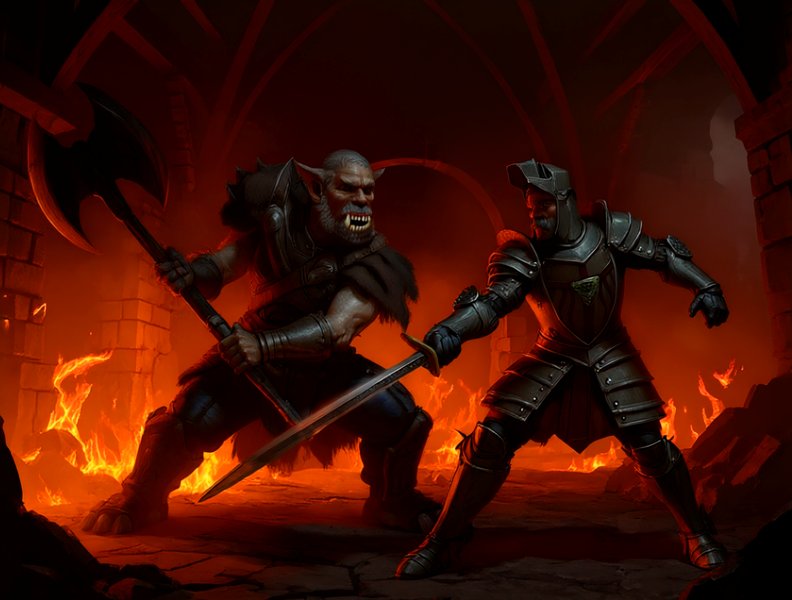 Один из паладинов схлестнулся с ворвавшимся в крепость в первых рядах орком. Превосходивший в мускульной силе дикарь размахивал секирой, способной запросто перерубить человека с одного удара. Грубая, но эффективная тактика его боя как раз и заключалась в том, чтобы просто попасть по противнику. Едва ли такой удар можно было блокировать. Но он выбрал не удачную цель. Уже седой, но от того не менее расторопный паладин даже не думал отступать. В своей броне, в которой он воевал едва ли не всю жизнь, он не чувствовал ни малейшего стеснения. Первый выпад орка пролетел мимо, даже не зацепив отскочившего вбок ветерана. Несмотря на инерцию, заставившую его наклониться вперёд, и не позволявшую тут же вновь поднять топор, орк тоже оказался не так прост, и смог спастись от контратаки, приняв удар меча на свой массивный наплечник, после чего отскочил, разрывая дистанцию. Двое противников застыли, глядя друг на друга. Это длилось лишь мгновение, но, Мильтену, в чью кровь от увиденного тут же выбросилась ударная доза адреналина, оно показалось вечностью.