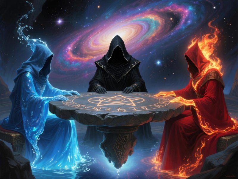 Мощный дубовый стол, который в иной ситуации мог бы служить крепостными воротами, не ломился от яств и напитков, но трое сидящих на столь же внушительного вида стульях, годящихся быть тронами старейшин какого-нибудь нордмарского клана, не испытывали ни малейшего неудобства от недостатка угощений. Стоило взять кусочек какого-то из угощений, как точно такой же появлялся на тарелке вновь. Стоило отпить из бокала вина, как он вновь наполнялся, а по велению мысли пившего мог поменять и сорт вина, и год сбора урожая, и время выдержки. Края зала, не освещённого ни свечами, ни какими ещё источниками света, терялись даже не во мраке или пустоте, а в полном отсутствии и того и другого. Любой пожелавший бы вглядеться в даль, просто бы не смог осознать, что там находится. Не было в этом удивительном месте ни теней, ни бликов, ни звуков или запахов, помимо тех, которые были угодны гостям и связаны с происходящим за столом. Каждый из сидящих там был одинаков, и столь же различен и ни на кого не похож. Будто бы близнецы, вырядившиеся в мантии разного цвета. Один был в чёрной с кровавыми каплями, которые непрерывно образовывались, будто сочились из самой ткани, а затем падали на каменный пол, разлетаясь в дребезги и растворяясь в воздухе. Второй был в красной, словно пламя мантии с золотым тиснением, светящимся мягким желтоватым светом, будто бы горящая свеча. Третий же был менее притязателен, и его сине-голубая мантия колыхалась как волны тихого моря. Их движущиеся наряды, пожалуй, всё равно были самым постоянным в их облике, потому что лица их были с трудом различимы и как будто бы отражали не внешность, а настроение. Молодой мужественный воин мог через мгновение стать морщинистым старцем для того, чтобы брошенный исподлобья взгляд производил большее впечатление. Тот, что в чёрном, и вовсе иногда становился прозрачным так, что сквозь плоть был виден скелет. Какое-то время все трое сидели молча, обмениваясь многозначительными взглядами, и иногда потягивая вино или пробуя сменявшиеся каким-то неведомым образом на столе закуски.