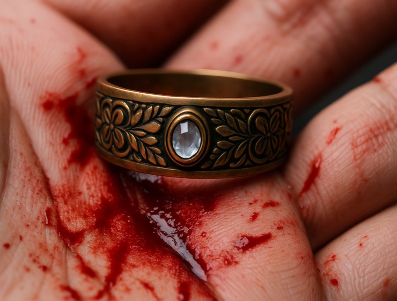 Мильтен сел на корточки рядом с умирающим и снял с его пальца то самое кольцо. В нём не было большой ценности, но вблизи оно оказалось более занятным, чем показалось издали. Оно было сделано из бронзы, и основной интерес представлял не металл, а очень аккуратно выгравированный витиеватый орнамент с растительным мотивом. Не сразу также бросалось в глаза, что в кольце имеется маленький камешек, который почти не выпирал наружу и выглядел так, будто бы капля воды застыла навечно в сделанном для неё мастером углублении. Вероятно, это был аквамарин, но Мильтен слабо разбирался в драгоценных камнях. Никогда не приходилось ни покупать их, ни продавать, ни даже ими владеть.