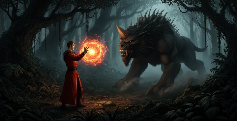 Как оказалось, это было весьма своевременным шагом, потому что не успел маг пройти и пары сотен метров, как услышал хруст ломающихся веток и шум, свидетельствующие о быстром приближении из зарослей чего-то тяжелого. Только лишь успел сфокусироваться в руках огненный шар, как из-за деревьев выскочила огромная стремительная тень. Огромными прыжками нечто неразборчиво клыкастое приближалось к нему, не оставляя сомнений в своих намерениях. У чародея была лишь одна попытка, чтобы попасть. Ещё с первой боевой тренировки он усвоил урок, что упредить движущуюся цель очень сложно. Времени на то, чтобы перенаправить огненный шар у него не было. Зверь был слишком быстр, его скачки были слишком высоки и непредсказуемы. Мильтен медлил, сосредоточенно глядя на надвигающуюся дикую смерть. Без сомнений, это был мракорис. Одного удара его лапы, не говоря уже об укусе острых, как сабля, клыков, было достаточно, чтобы убить, раскромсать, раздавить. Но этот хищник никогда не атаковал на бегу. Его излюбленной тактикой был резкий рывок, удар мощной передней лапой, когти которой могли разорвать любую кожаную броню и даже пробить железный доспех. Затем, этот обычно ночной охотник довершал дело, разрывая оглушённую жертву зубами. Уклониться от удара было крайне сложно, хотя опытные охотники именно так и побеждали, если дело доходило до рукопашной схватки. Впрочем, это удавалось им, как правило, лишь благодаря тому, что днём мракорис был менее ловок. И даже несмотря на это мало кто мог похвастаться такой удачей. И ещё меньше людей были готовы добровольно повторить такой опыт. Всё это пронеслось в голове у Мильтена за те пару секунд, что он ждал приближения монстра.