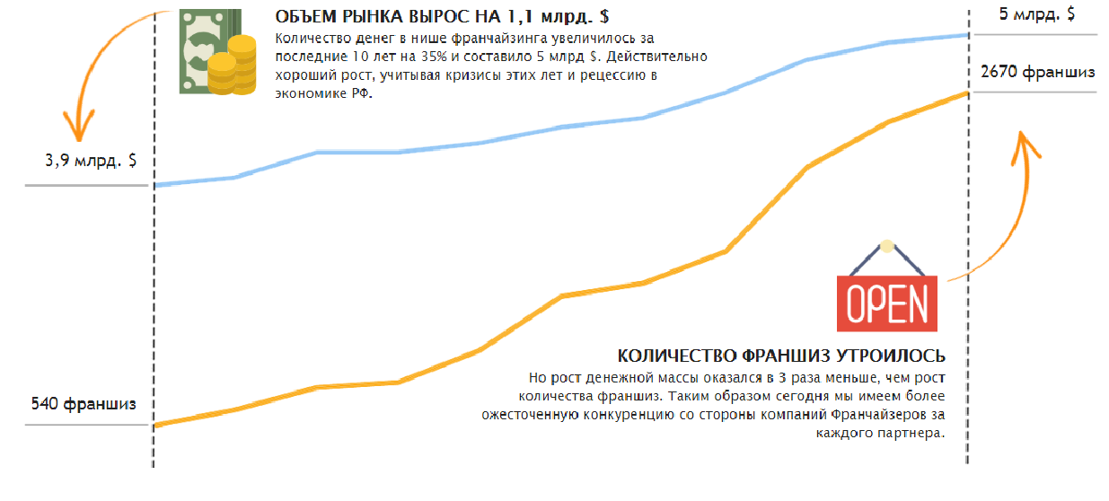 Рынок франчайзинга сегодня очень и очень конкурентен. Если раньше было достаточно сделать более-менее качественную упаковку и начать продавать, то сейчас практически в любой нише есть уже пять-шесть франшиз, прочно закрепившихся на рынке, – они имеют обширную филиальную сеть, положительные отзывы от партнеров, а их названия уже знакомы людям. В итоге франшизам-новичкам приходится очень нелегко. Чтобы пробиться, вы должны иметь уникальный продукт, отличную упаковку, быть фанатом своего бизнеса и очень хорошо уметь продавать. Иначе вы сильно рискуете пополнить эту плачевную статистику: