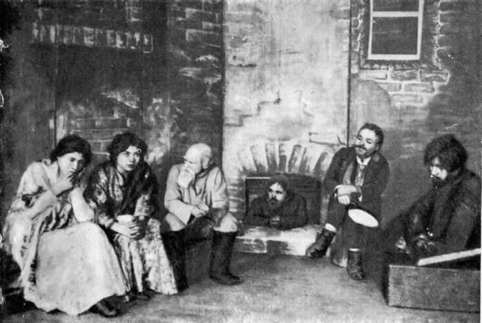 Сцена из пьесы «На дне» А, М. Горького, поставленной в тюрьме при участии Кирова-Кострикова. Томск. 1908.