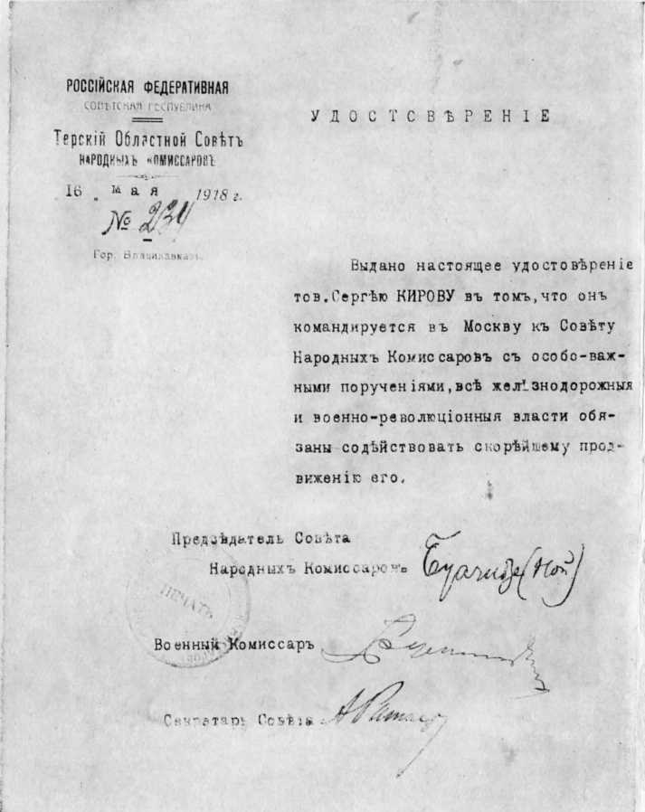 Удостоверение Кирова за подписью председателя Совнаркома Терской республики Буачидзе. Владикавказ. 1918.