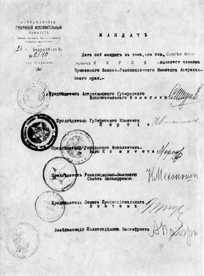Мандат Кирова, члена Временного военно-революционного комитета Астраханского края. 1919.