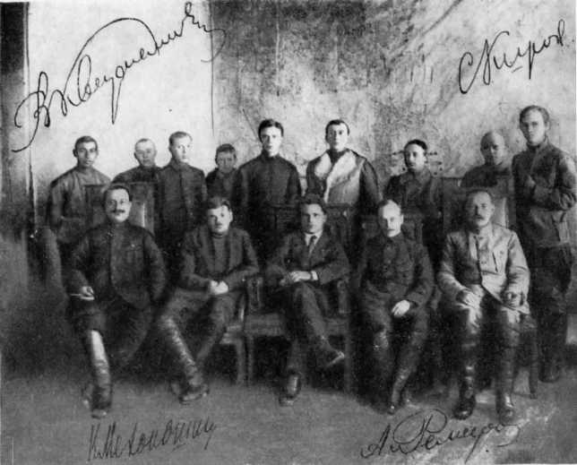Среди руководителей и штабных работников XI армии. Первый ряд (слева направо): В М. Квиркелия, М. И. Василенко, Киров, К. А. Механошин, А. К. Ремезов. Астрахань. 1920. С фотоснимка, принадлежавшего, как полагают, Василенко.