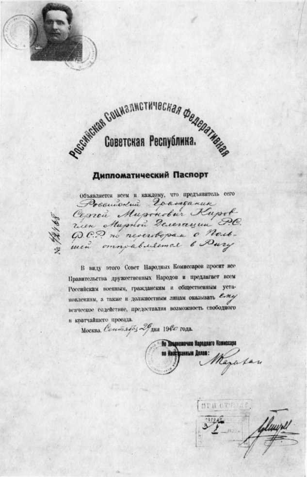 Дипломатический паспорт Кирова, члена советской делегации по переговорам с панской Польшей о заключении мира. 1920.