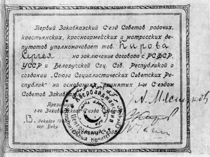 Мандат Кирова, члена делегации трудящихся Закавказья по заключению договора с РСФСР. УССР и БССР о создании Союза ССР. От имени президиума Закавказского съезда Советов все такие мандаты подписывали Мясников и Киров, а также секретарь съезда П. И. Чагин. На мандате, выданном Кирову, он свою подпись зачеркнул. Баку. 1922.