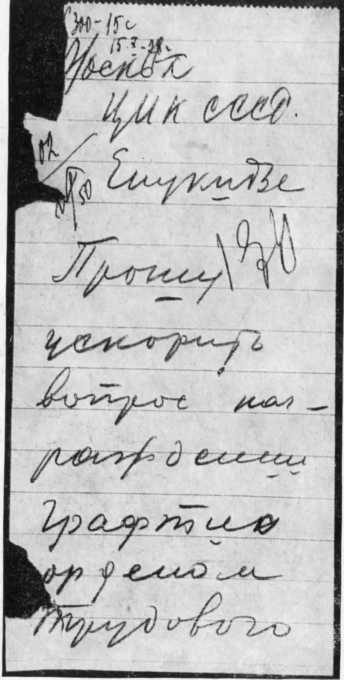 Телеграмма Кирова секретарю ЦИК СССР А. С. Енукидзе с просьбой ускорить награждение орденом ученого-гидростроителя Г. О. Графтио. Ленинград, 1928. Автограф.