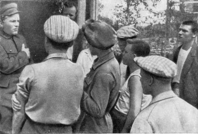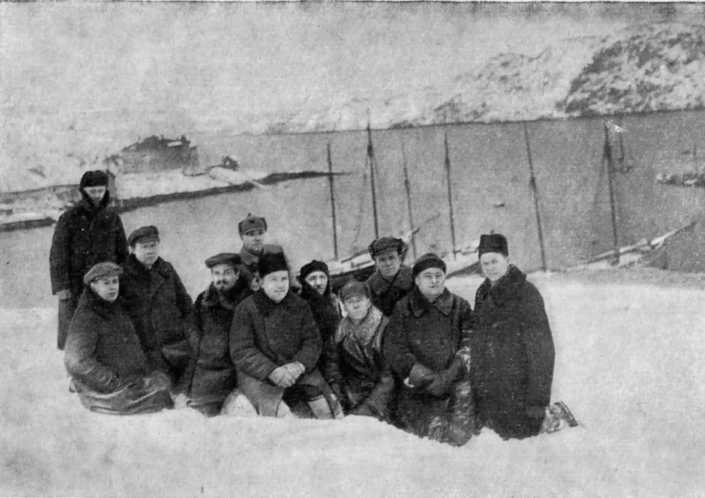 Киров среди комсомольцев на сланцевых рудниках. Близ Гдова, 1934
