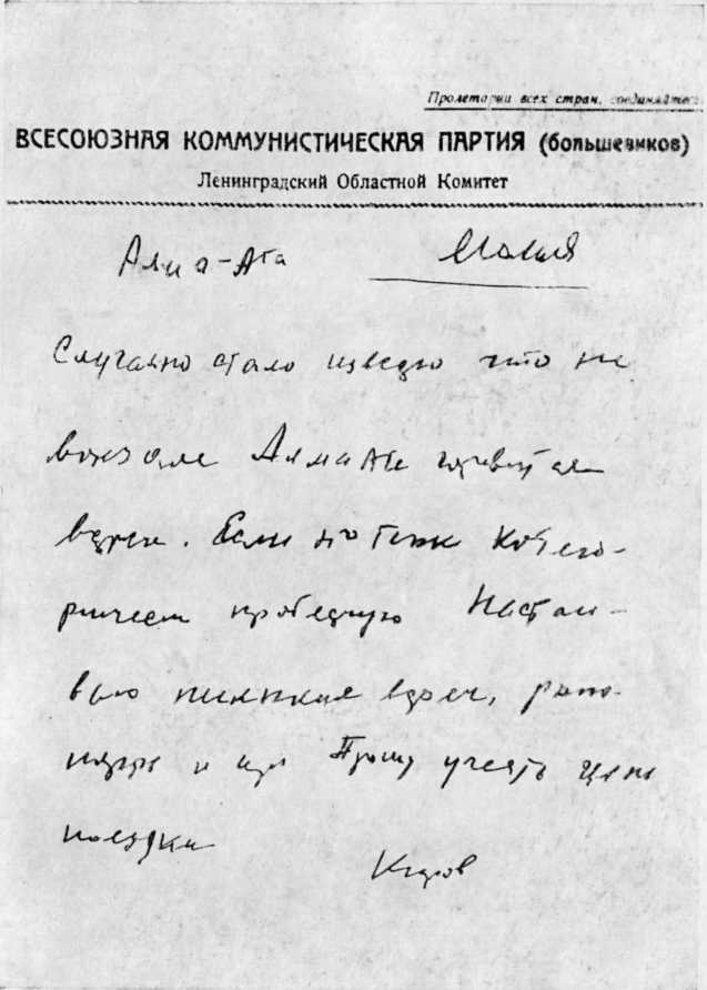 Осенью 1934 года ЦК ВКП(б) направил Кирова в Казахстан, где срывались хлебозаготовки С пути Сергей Миронович послал в Алма-Ату местным руководителям телеграмму-молнию: «Случайно стало известно, что на вокзале Алма-Ате готовится встреча. Если это так, категорически протестую. Настаиваю никаких встреч, рапортов и проч. Прошу учесть цель поездки». Автограф.