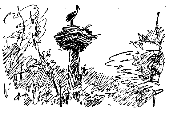 На околице Михайловского всегда немноголюдно. Она так велика, что и тысяча человек на ней малоприметна. Такое редко где увидишь, разве что во сне. Здесь всегда спокойно и ласково. В особенности в час, когда день подходит к концу и наступает вечер, когда засыпают воды, травы, деревья. Лишь на лугах таинственно перекликаются дергачи. В небе спешат какие-то большие снежно-белые, поразительной красоты птицы, – это аисты. Дом аиста на высокой, очень старой, еще ганнибаловской ели – единственной на околице. Аистов радостно встречают молодые аистята – они безмолвно размахивают крыльями, кружатся хороводом по гнезду…