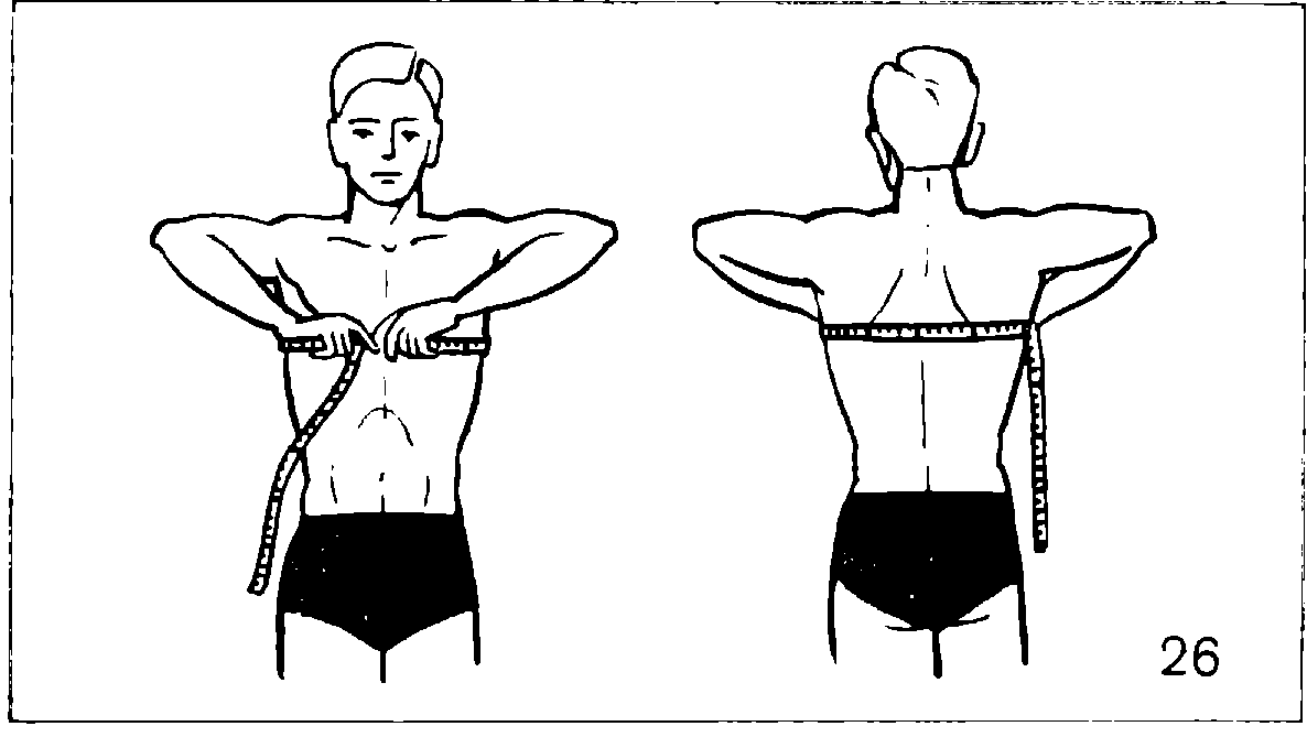 Улучшение таких показателей физического развития, как окружность грудной клетки, талии, бедра, голени, плеча и предплечья, как ширина плеч, урегулирование веса, также является в практике самоконтроля объективным признаком и говорит о правильном использовании атлетических упражнений и о росте вашей тренированности. Техника домашних измерений несложна. Чтобы определить окружность грудной клетки (рис. 26), возьмите сантиметровую ленту правой рукой за нулевое деление, а левой за середину. Поднимите локти и наложите ленту на грудную клетку так, чтобы сзади она проходила под нижними углами лопаток, а спереди по нижнему краю сосковых кружков. Опустите локти и соедините концы ленты на правой стороне груди, около грудины. Во время фиксации ленты посчитайте вслух до трех. Число в месте соединения ленты показывает окружность грудной клетки в спокойном состоянии. Затем сделайте максимальный вдох и на высоте вдоха зафиксируйте результат измерения. После этого измерьте окружность грудной клетки на предельном выдохе. Разность между двумя последними результатами показывает экскурсию (подвижность) грудной клетки.