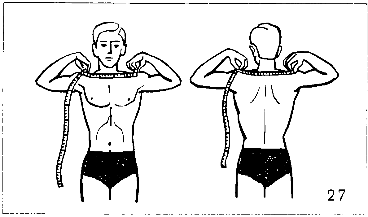 Для определения ширины плеч (рис. 27) вначале нащупайте выступающие костные бугорки над плечевыми суставами. Возьмите сантиметровую ленту левой рукой за нулевое деление и прижмите ее к левому бугорку. Правой рукой протяните ленту по линии ключиц к правому бугорку. Полученное число показывает ширину плеч.