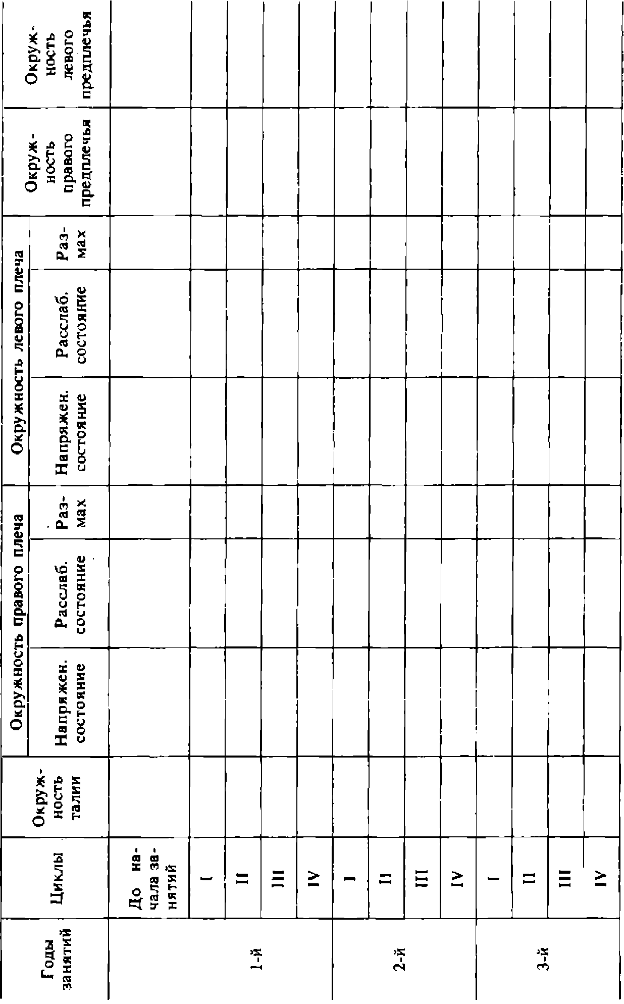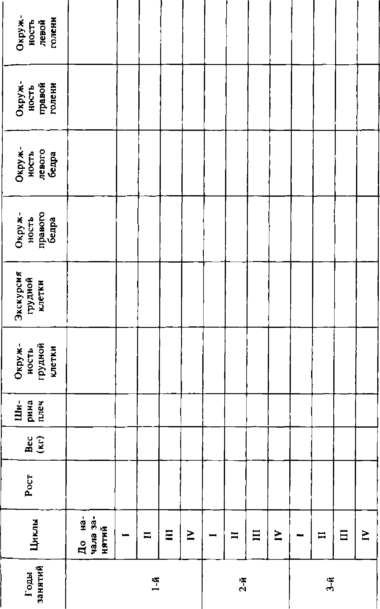 Измерение показателей физического развития проводите перед началом занятий атлетической гимнастикой, а затем после каждого цикла тренировок. Фиксировать результаты измерений целесообразно в такой таблице: