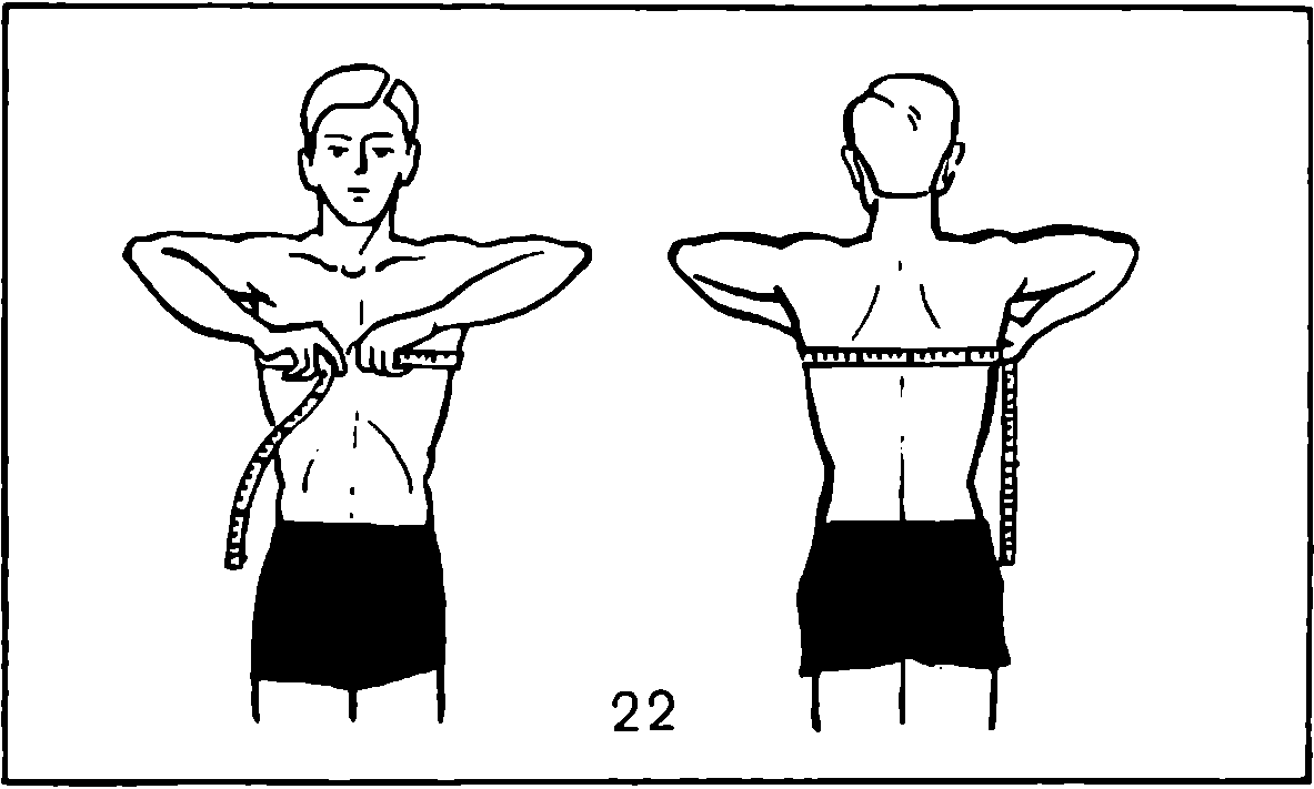 Улучшение таких показателей физического развития, как окружность грудной клетки, талии, бедра, голени, плеча и предплечья, как ширина плеч, урегулирование веса, также является в практике самоконтроля объективным признаком и говорит о правильном использовании атлетических упражнений и о росте вашей тренированности. Техника домашних измерений несложна. Чтобы определить окружность грудной клетки (рис. 22), возьмите сантиметровую ленту правой рукой за нулевое деление, а левой за середину. Поднимите локти и наложите ленту на грудную клетку так, чтобы сзади она проходила под нижними углами лопаток, а спереди по нижнему краю сосковых кружков. Опустите локти и соедините концы ленты на правой стороне груди, около грудины. Во время фиксации ленты сосчитайте вслух до трех. Число в месте соединения ленты показывает окружность грудной клетки в спокойном состоянии. Затем сделайте максимальный вдох и на высоте вдоха зафиксируйте результат измерения. После этого измерьте окружность грудной клетки на предельном выдохе. Разность между двумя последними результатами показывает экскурсию (подвижность) грудной клетки.