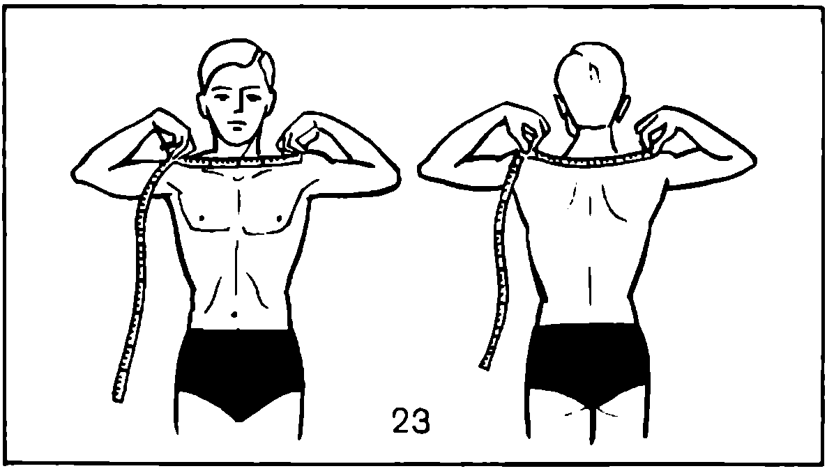 Для определения ширины плеч (рис. 23) вначале нащупайте выступающие костные бугорки над плечевыми суставами. Возьмите сантиметровую ленту левой рукой за нулевое деление и прижмите ее к левому бугорку. Правой рукой протяните ленту по линии ключиц к правому бугорку. Полученное число показывает ширину плеч.