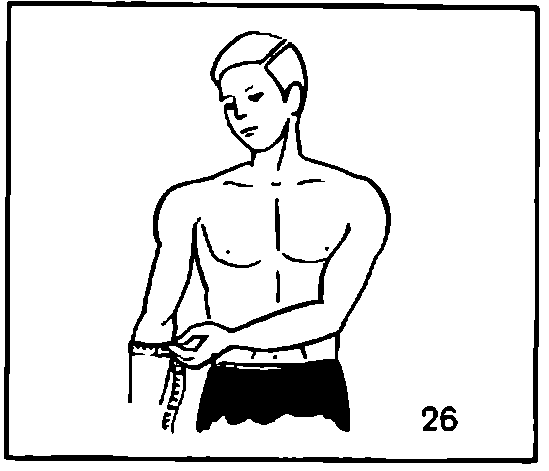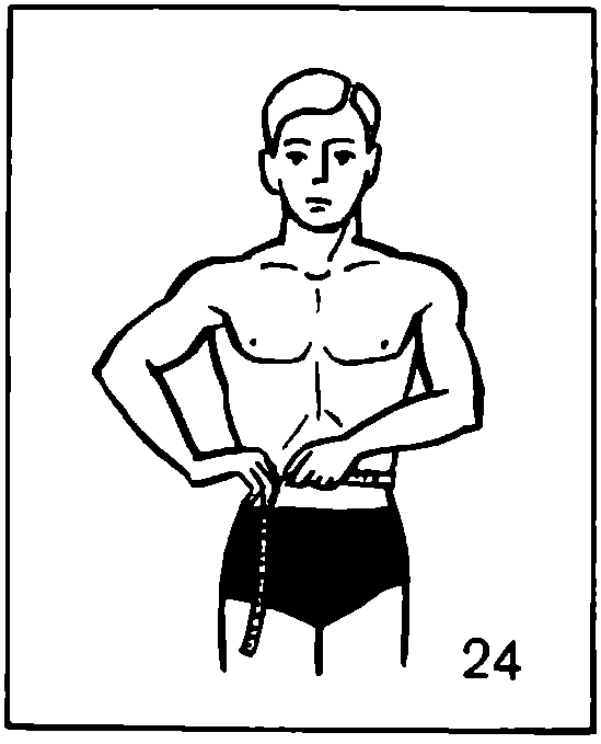 Окружность талии измеряется так (рис. 24). Возьмите сантиметровую ленту правой рукой за нулевое деление, а левой – за середину и, определив с ее помощью самое узкое место туловища между грудной клеткой и тазом, измерьте окружность. Следите за тем, чтобы сзади и спереди лента была на одном уровне.