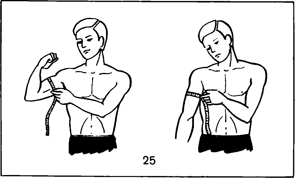 Окружность плеча определяется сначала в напряженном, а затем в расслабленном состоянии (рис. 25). Согните в локтевом суставе руку, сжатую в кулак, и поднимите кулак к плечу. Другой рукой возьмите ленту за нулевое деление, наложите на наиболее выпуклое место двуглавой мышцы (бицепса) так, чтобы сверху и снизу она была на одном уровне, и соедините концы на внутренней стороне. Зафиксируйте показатель. Затем, не снимая ленты, опустите руку вниз, расслабьте мышцы и в том же месте возьмите второй размер. Разница между результатами первого и второго измерений и характеризует развитие мышцы; это так называемый «размах плеча».