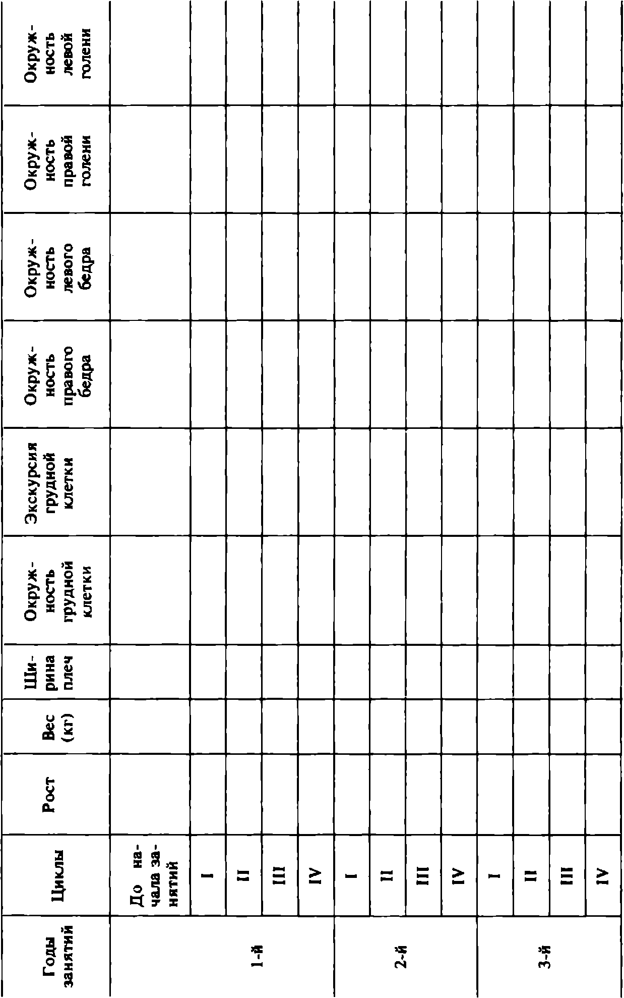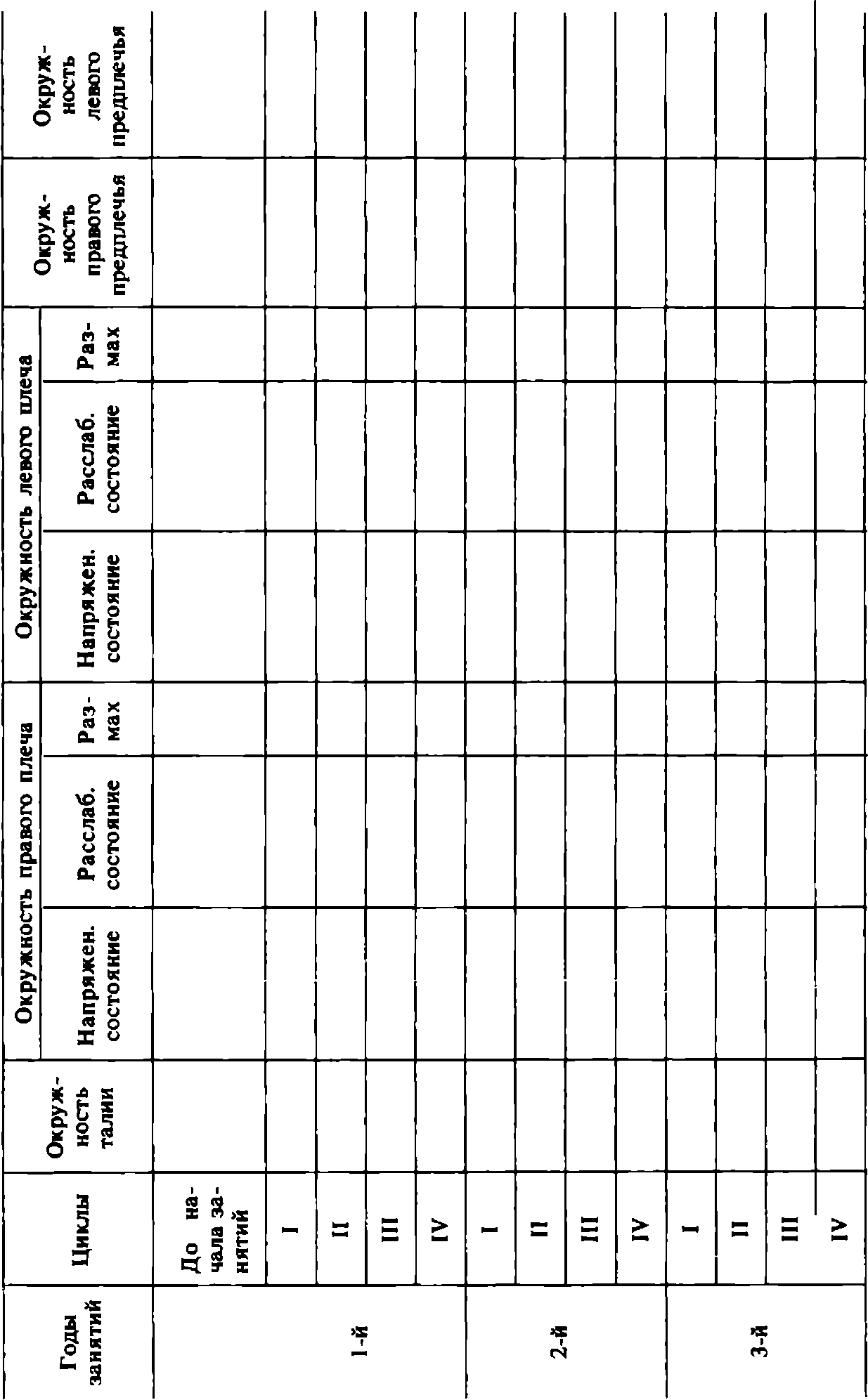 Измерение показателей физического развития проводите перед началом занятий атлетической гимнастикой, а затем после каждого цикла тренировок. Фиксировать результаты измерений целесообразно в такой таблице: