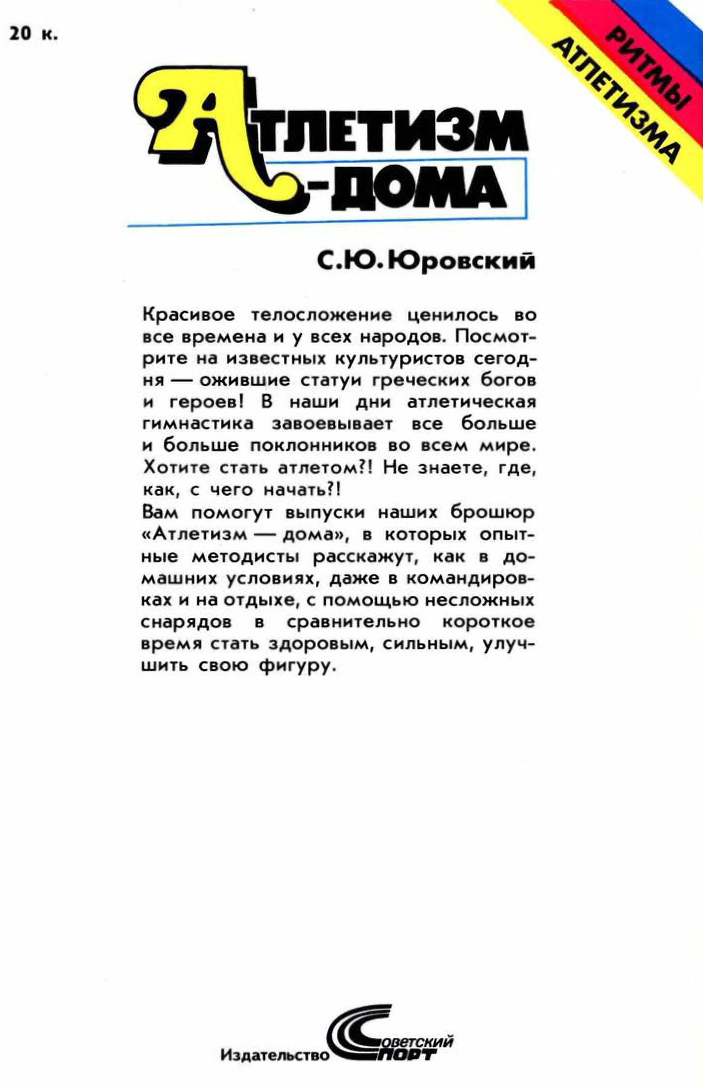 Вам помогут выпуски наших брошюр «Атлетизм – дома», в которых опытные методисты расскажут, как в домашних условиях, даже в командировках и на отдыхе, с помощью несложных снарядов в сравнительно короткое время стать здоровым, сильным, улучшить свою фигуру.