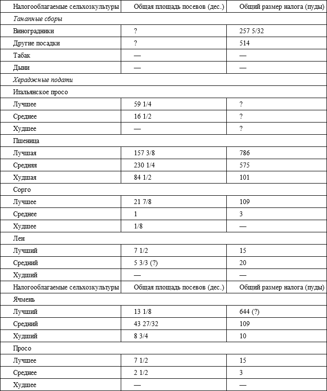 Взяв в июле «пробный умолот пшеницы», составив протоколы, собрав отпечатки пальцев у местных жителей и поставив печать у сельского старосты, комиссия установила, что средний урожай пшеницы в данной местности составляет 35 пудов (573,3 кг) с 1 дес., средняя цена за пуд пшеницы – 50 коп., следовательно, средний валовой доход от десятины пшеницы равен 17 руб. 50 коп. Поскольку пшеница была преобладающей культурой (44 % от всех посевов, еще 30 % составляли лесонасаждения, остальное – прочие посевы, клевер, сады, виноградники), то вся засеваемая площадь (332,4 дес.) умножалась на указанный средний доход, и получался валовой доход в размере 5817 руб.; 10 % этой суммы – 581 руб. 70 коп. – назначались «даче» в качестве государственного поземельного налога. Вместе с налогами на вторую «дачу» – Тахтапез – общая сумма подати со всего сельского общества увеличилась по сравнению с прежним уровнем почти на 40 %324324