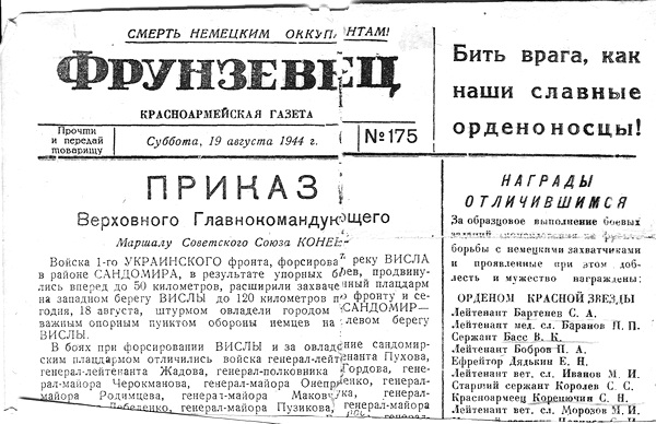 В августе 1944 г. меня вместе с другими воинами нашей дивизии наградили орденом «Красной Звезды». Список награжденных был опубликован в дивизионной газете.