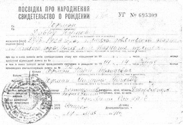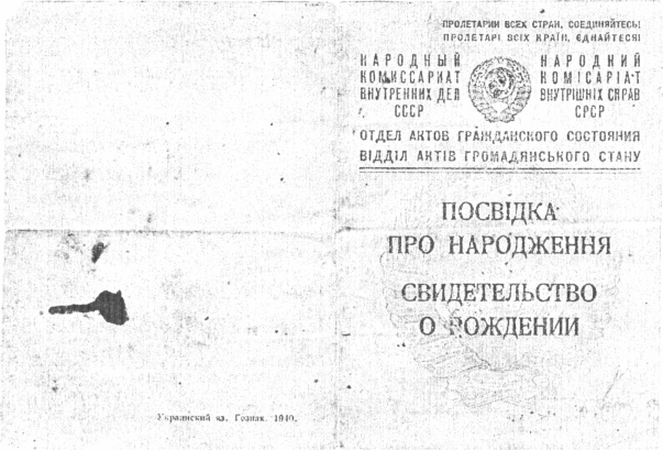 1, 2. Свидетельство о рождении Давида Хоффмана (Украина, 1941 г.)