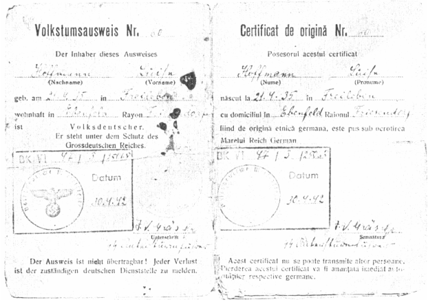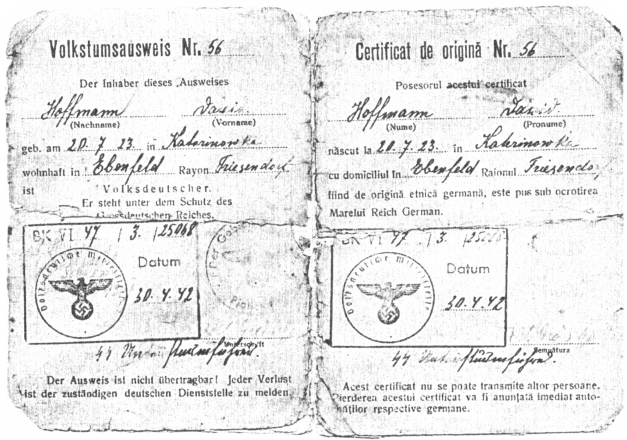 3,4. Паспорт «фольксдойче» Хоффманов Давида Карловича (вверху) и Елизаветы Карловны (внизу) (Германия. 1942 г.)