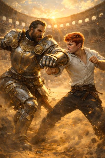 Однако, к моему удивлению, не успел первый мастер спрыгнуть на песок Арены, как через каменное ограждение со стороны трибун перемахнула еще одна фигура. Не слишком внушительная внешне, надо сказать. Так, «на троечку» по параметрам шкафообразности – зато пылающая сверхвнушительной аурой.