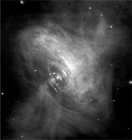 Внутренняя часть Крабовидной туманности непосредственно вблизи пульсара. Видна структура, формирование которой связано с его активностью.