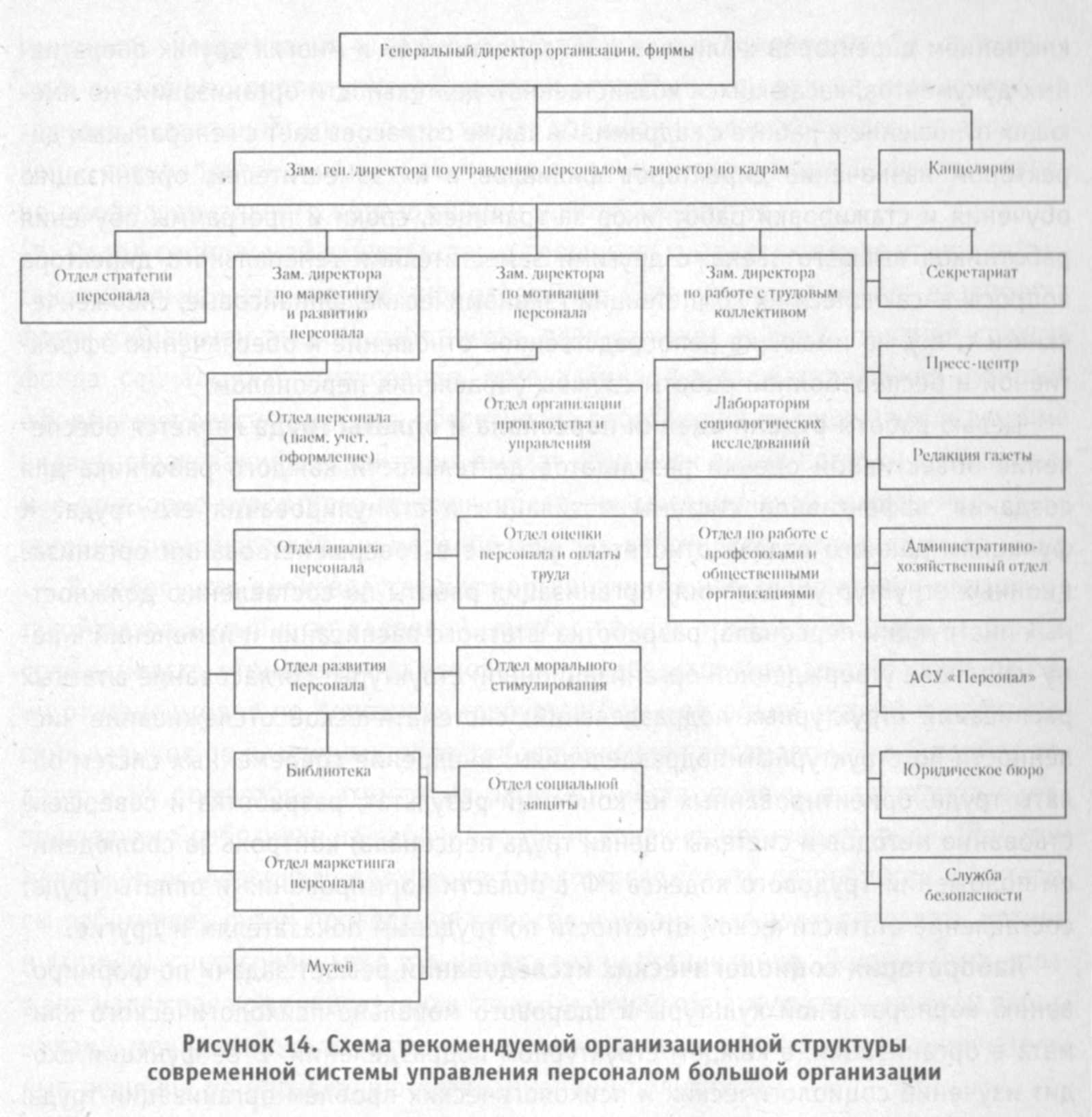 Структуры управления мотивацией персонала практически совпадают со структурами служб управления персоналом, тем более что менеджеры по персоналу как раз и занимаются обеспечением эффективной мотивации на предприятиях. Общеизвестны ставшие классическими схемы управления персоналом, принятые на крупных государственных предприятиях. В них включены различные подразделения, отвечающие за основные направления работы с персоналом. Но в то же время в службах этих предприятий часто нет штатных специалистов, отвечающих за психологическую работу с персоналом, или служб, выявляющих неудовлетворенность трудом у сотрудников путем проведения опросов. Наряду с крупными государственными организациями существуют и крупные негосударственные организации, в которых принята несколько иная структура управления персоналом, более соответствующая современным рыночным условиям. Такая типовая рекомендуемая схема представлена на рисунке 141. Дадим некоторые пояснения к функциям, выполняемым звеньями данной схемы.