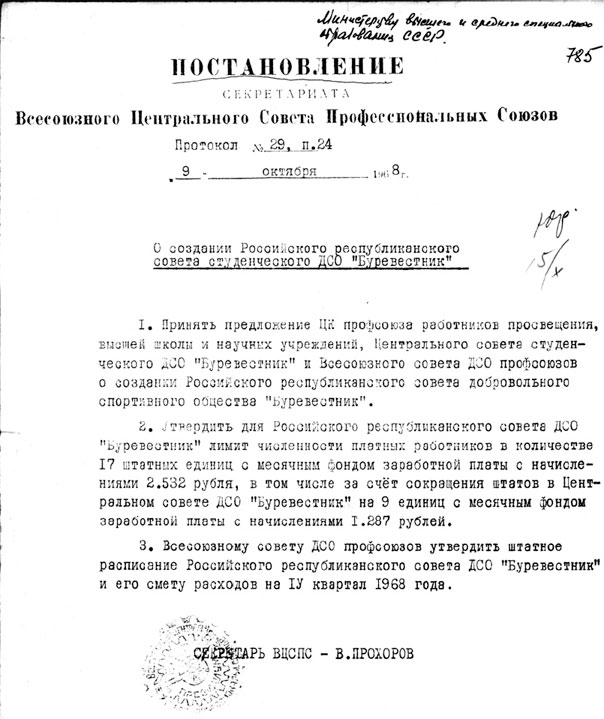 Рис. 3. Постановление ВЦСПС о создании Российского республиканского совета ДСО «Буревестник»