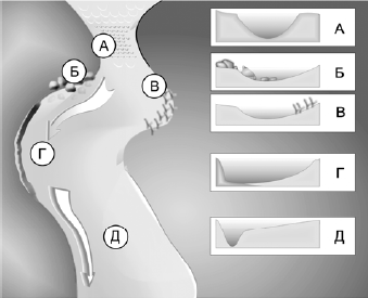 а– узкий проток; б – валуны на дне; в – участок, покрытый растительностью; г – подмоины у глинистого берега; д – глубокий проток на широком и мелком участке реки