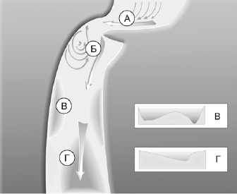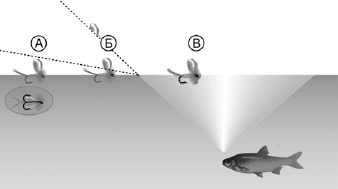 Рыба видит плывущую к ней муху (рис. 7). Когда муха находится за пределами зрительного конуса (а), виден только фрагмент, находящийся под водой, и если нет ветра – его отражение на поверхности воды. Затем рыба начинает различать крылышки мухи (б), причем в результате преломления лучей они выглядят искривленными. После того как мушка попадает в область зрительного конуса, она становится видна вся целиком (в). Отражение же подводной части мухи о поверхность воды пропадает.