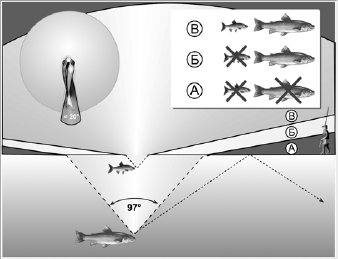 Вследствие такого физического явления, как преломление световых лучей в воде, рыба способно заметить появившегося на берегу рыболова несколько раньше, чем это можно себе представить. Поле зрения рыбы, охватывающее все то, что происходит над водой, можно представить в виде конуса с углом в 97° и вершиной в зрачке ее глаза. Остальной поток света отражается от поверхности воды. Лучи же, выходящие из воды, преломляются и «охватывают» на поверхности все, за исключением предметов, расположенных под углом к горизонту, меньшим 10°. Для более крупной рыбы, находящейся в глубине (рис. 6), невидимым остается пространство а. Все то, что находится за его пределами (зоны б и в), она видит. Для рыбки, плавающей поверху, для обозрения доступна лишь зона в. Таким образом, чем глубже рыба стоит в воде, тем меньше шансов на то, чтобы остаться для нее незамеченным. Вы еще не успели приблизиться к ней, а она уже обратила внимание на «что-то лишнее» на привычном фоне и поэтому, возможно, опасное. А инстинкт самосохранения никто не отменял. Поэтому спровоцировать ее атаку будет значительно тяжелее, если даже она и не покинула свою стоянку. При желании, зная глубину нахождения рыбы, можно вычислить дистанцию безопасной ловли. Если, например, рыба стоит на глубине 3 м, то это расстояние для рыболова в положении сидя будет равно около 8 м, а для стоящего на уровне воды – 14 м.