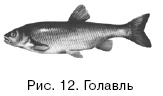 Голавль (Leuciscus cephalus)В благоприятных условиях голавль вырастает до больших размеров. По некоторым данным он достигает длины 80 см и веса до 8 кг. Голавль отличается от других рыб семейства карповых своим брусковатым телом и широколобой головой, которой он и обязан своим названием. У него крупная чешуя с легким золотистым оттенком, ярко-оранжевые грудные и брюшные плавники, а спинной и хвостовой – черной окраски (рис. 12).