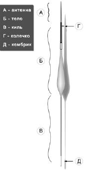 В целом современный поплавок состоит из следующих составляющих: антенны, тела, киля, колечка и кембрика (их может быть два) для лески. Величина, форма, месторасположение по отношению друг к другу этих элементов определяют форму модели, от которой зависят основные качества поплавка – его чувствительность и устойчивость. Эти два, плохо сочетающихся, а порой и антагонистических свойства в конечном счете определяют назначение модели, тем более, что при изготовлении макета должно приниматься во внимание не только сопротивление, возникающее при поклевке (пока не важно, на подъем ли работает поплавок или на погружение). Поплавок – это прежде всего сигнализатор поклевки, что должно быть видно.