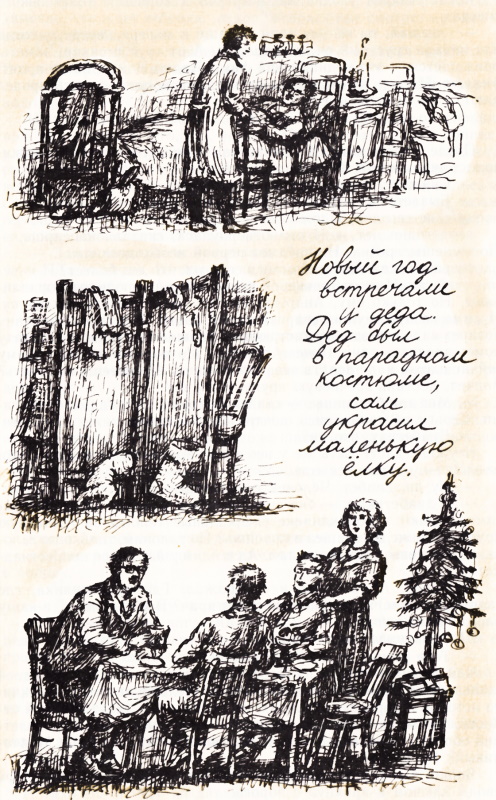 Новый год они встречали у деда. Дед был в парадном костюме, сам украсил маленькую елку. Мама испекла пирог с капустой, дед поставил на стол коробку с тортом.